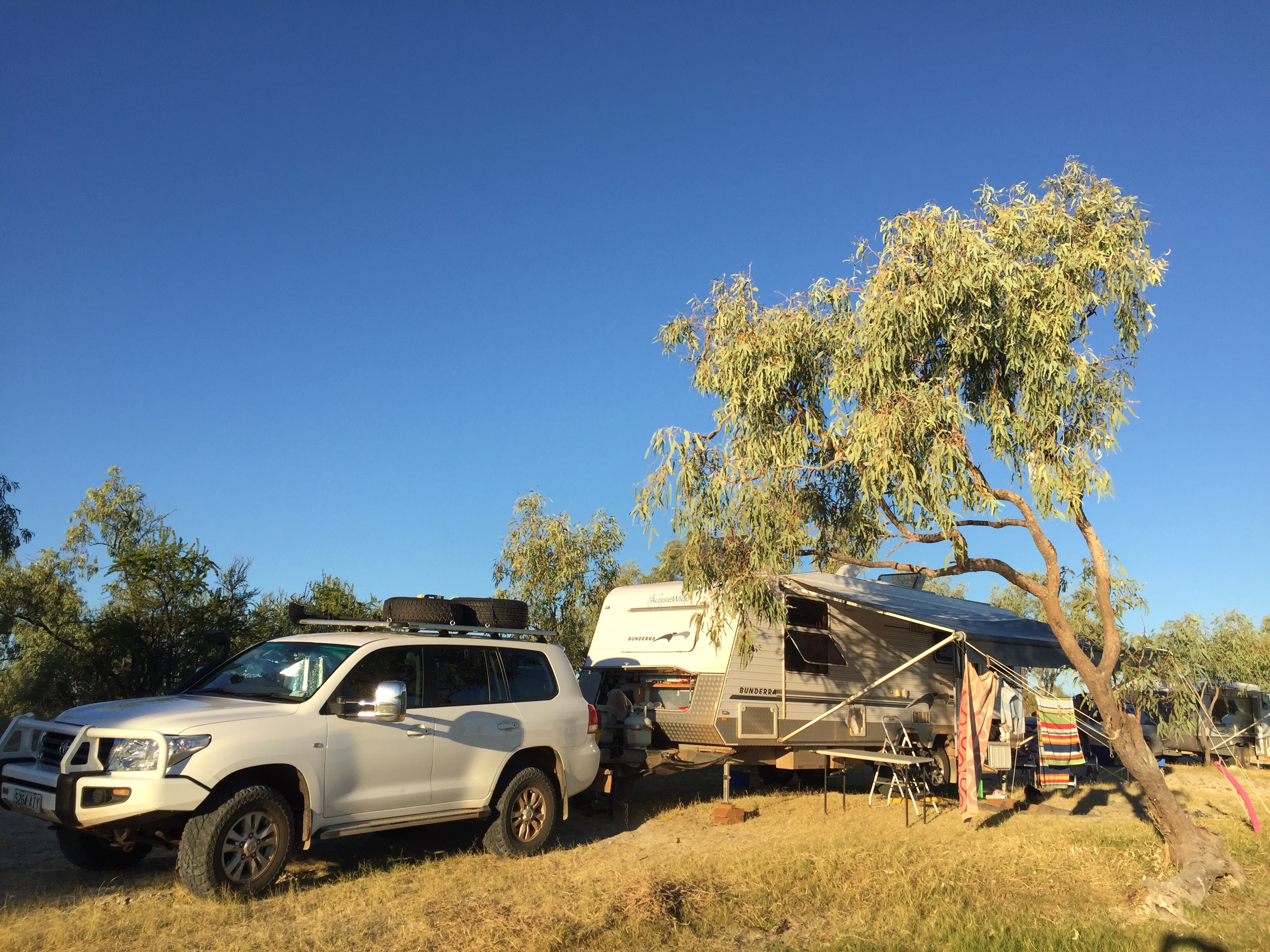 Next stop was a billabong on the Georgina River just out of Camooweal. This was a very nice area, although very slippery on the clay flats and some vans had been bogged trying to find their way in or out of the many camp sites near the billabong. We stayed a couple of days, enjoying brolgas, eagles, kingfishers, ibises and egrets during the day and campfires under a full moon at night.