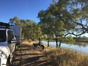 Next stop was a billabong on the Georgina River just out of Camooweal. This was a very nice area, although very slippery on the clay flats and some vans had been bogged trying to find their way in or out of the many camp sites near the billabong. We stayed a couple of days, enjoying brolgas, eagles, kingfishers, ibises and egrets during the day and campfires under a full moon at night.