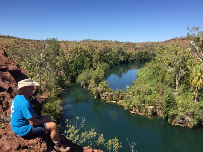 During the 520 km, 8.5 hour drive to Adels Grove we saw more kangaroos than we have ever seen in one day, plus wedge-tailed eagles, brolgas, wild pigs and hundreds of cattle. We remember Adels Grove as one of our favourite places from our 2010 trip and, after dry and dusty roads for the past week, this oasis is very pleasant. A deep gorge with beautiful blue flowing water runs through the region, with deep red cliffs and an amazing range of green trees and shrubs.