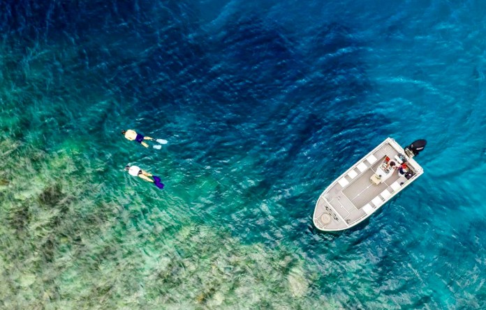 Jo, 2nd from left, relaxing on a tropical island while Ted was snorkeling nearby