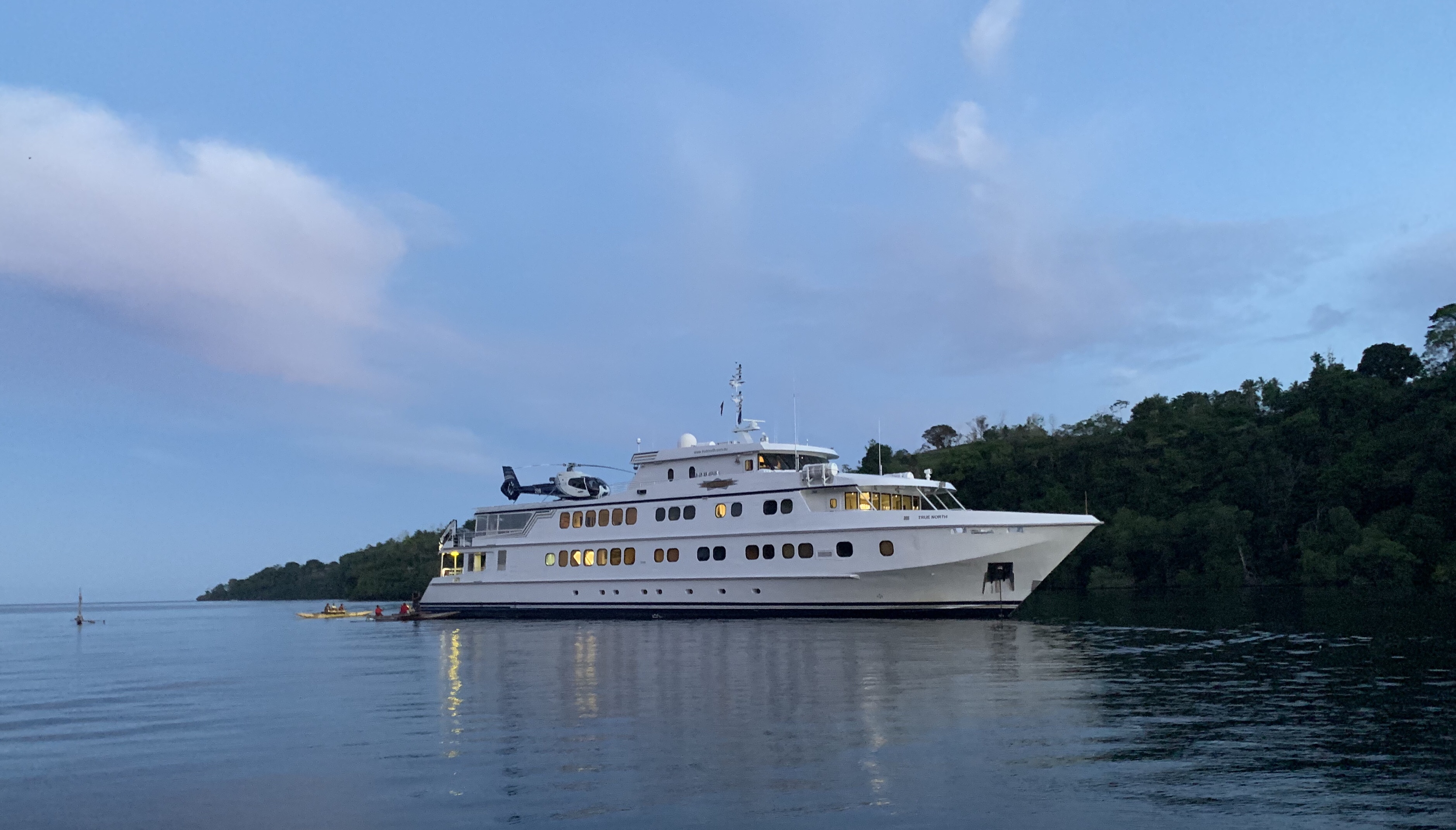 True North at anchor, sunset at Tufi