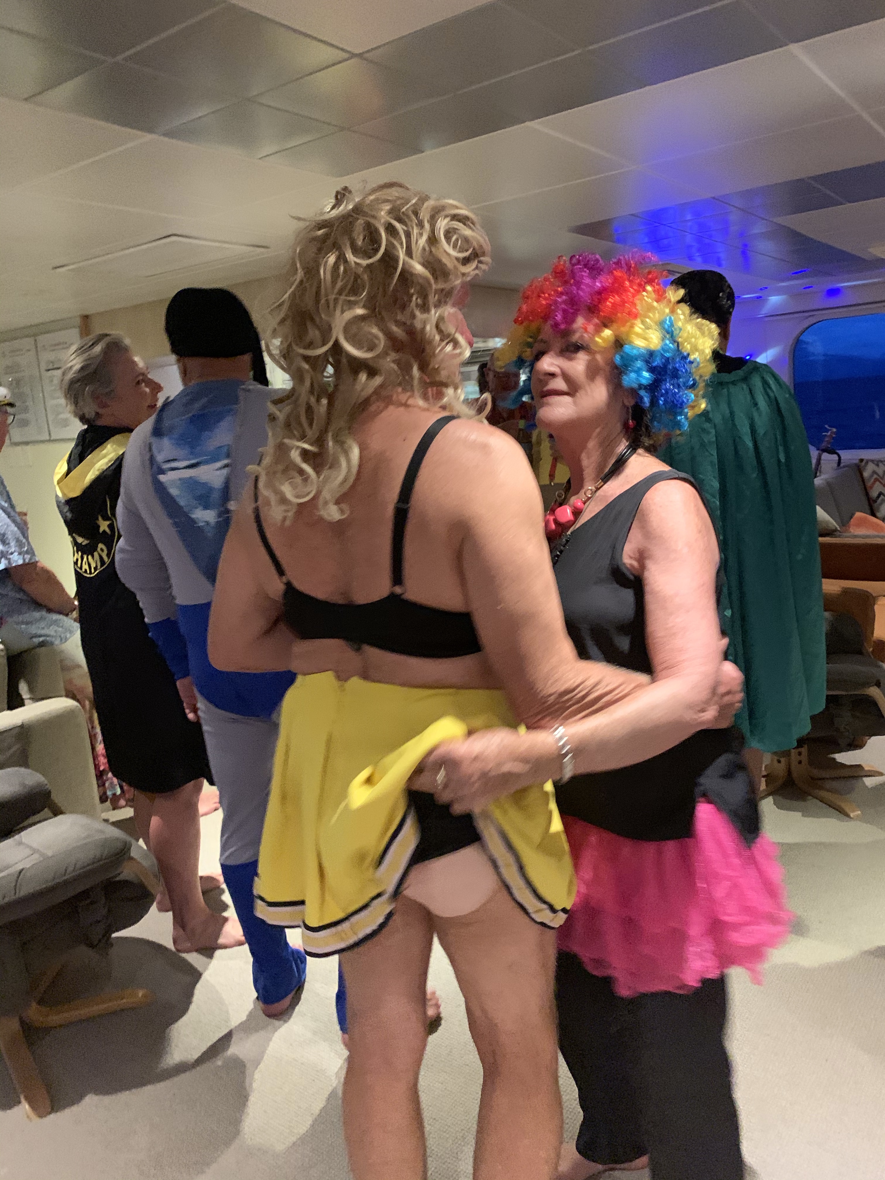 Then it was party time. True North carries lots of old clothing for fancy dress and, helped by cocktails we all soon got into party mode. There were some crazy outfits. Jo went in a red petticoat and I had on a short cheer leaders skirt with black bra.