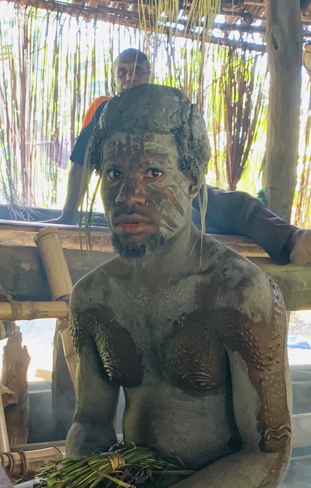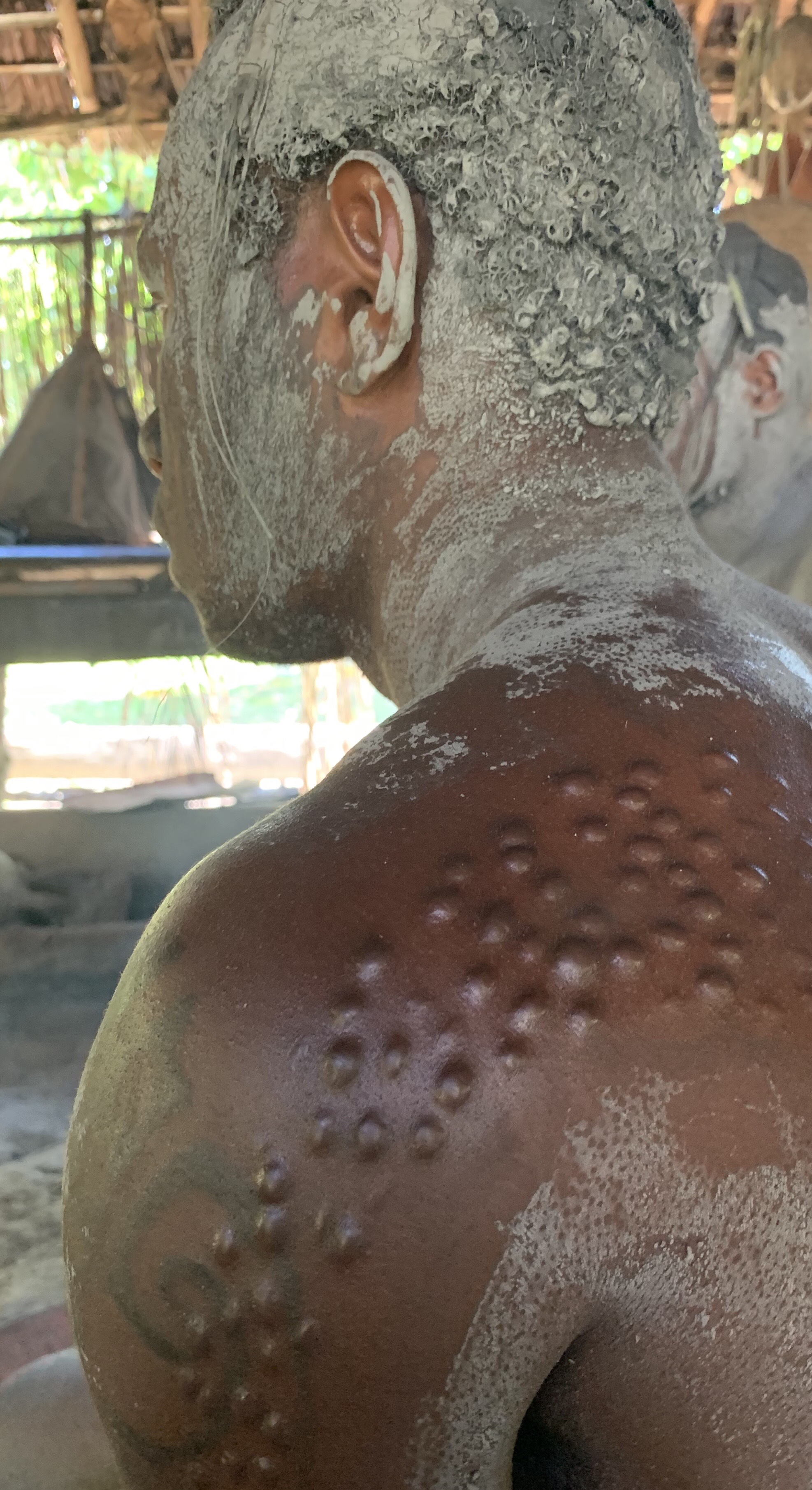 A short walk brought us to a Spirit House where several young men where nearing the closing stages of their initiation ceremony. To demonstrate their manhood they undertook a painful scarification process during which their skin was cut with a razor blade and treated with mud so that when it healed after about 6 weeks their skin resembled the skin of a crocodile. Luckily the healing process was almost finished when we saw it.